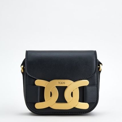 マキシサイズのチェーン モチーフ メタルアクセサリーを配したエレガントなスムース レザーのミニ バッグ。マグネット クロージャー付きのフラップ、調節可能なショルダーストラップを合わせました。