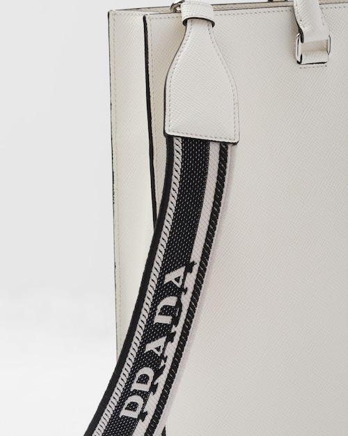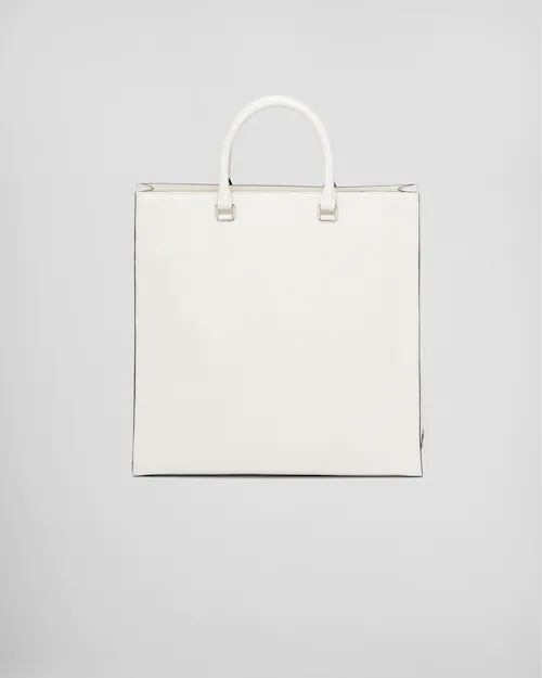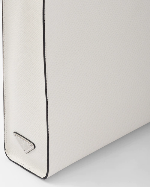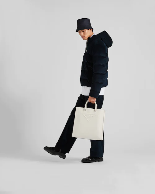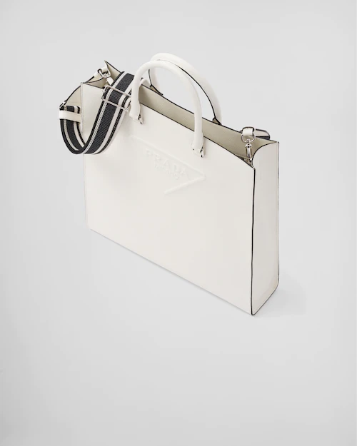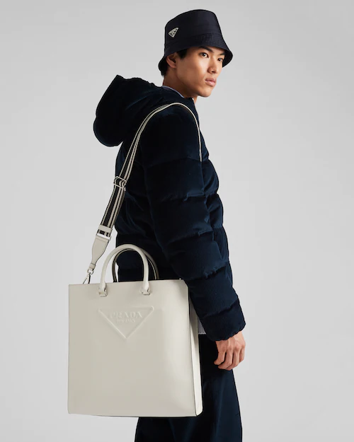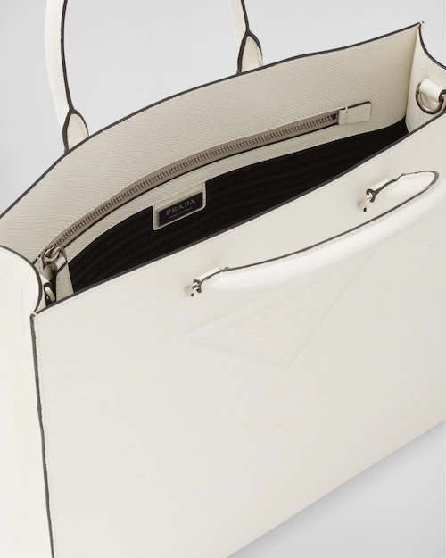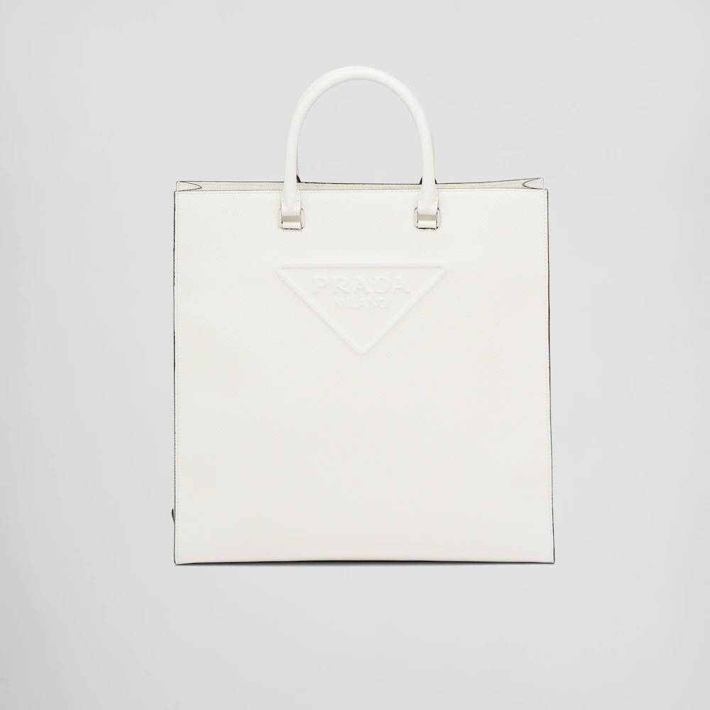 プラダを象徴する素材である、クロスハッチ加工とワックス仕上げが特徴の「サフィアーノ」レザー(牛革)を使用した、洗練されたシンプルなラインのトートバッグ。プラダを象徴するトライアングルロゴをアレンジした大きなエンボス加工のディテールがフロントを飾ります。再生ナイロン糸を使用した革新的なファブリックであるRe-Nylonのライニングで仕上げたデザイン。