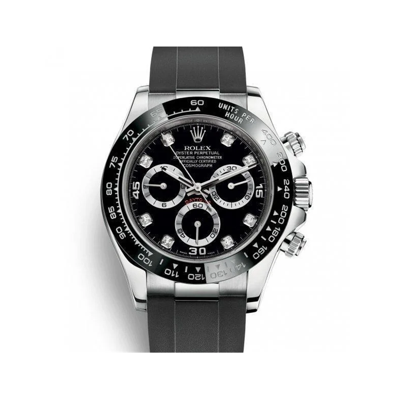 18 ct ホワイトゴールドのオイスター パーペチュアル コスモグラフ デイトナは、ブラック、ダイヤモンド入りダイアルとオイスターフレックスブレスレットを備え、ブラック セラクロムタキメーターベゼルが特徴的である。