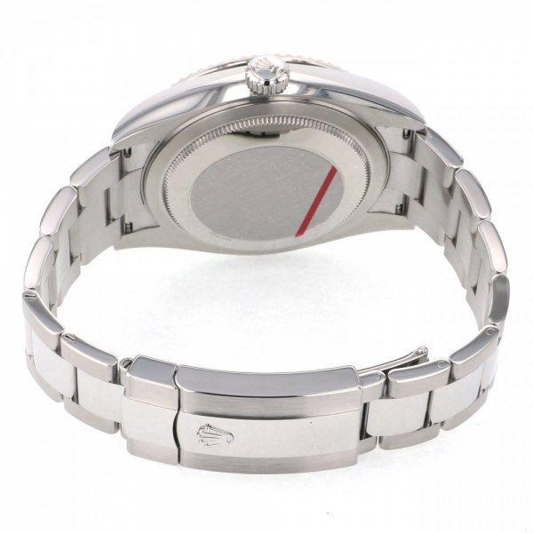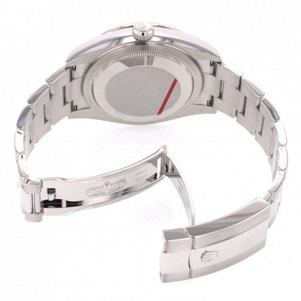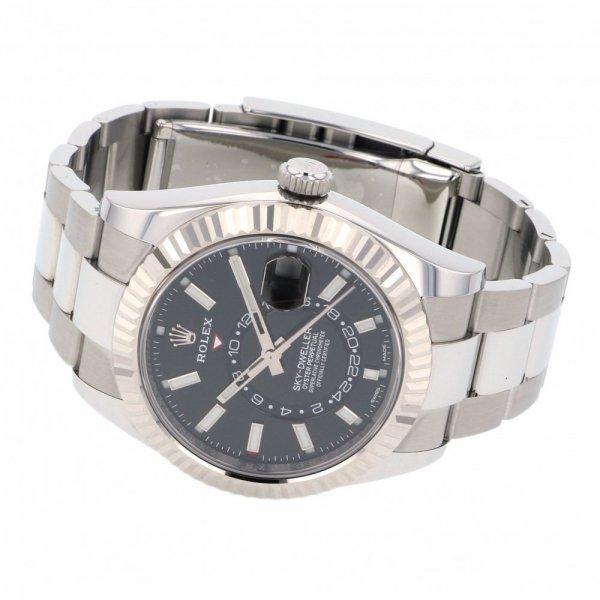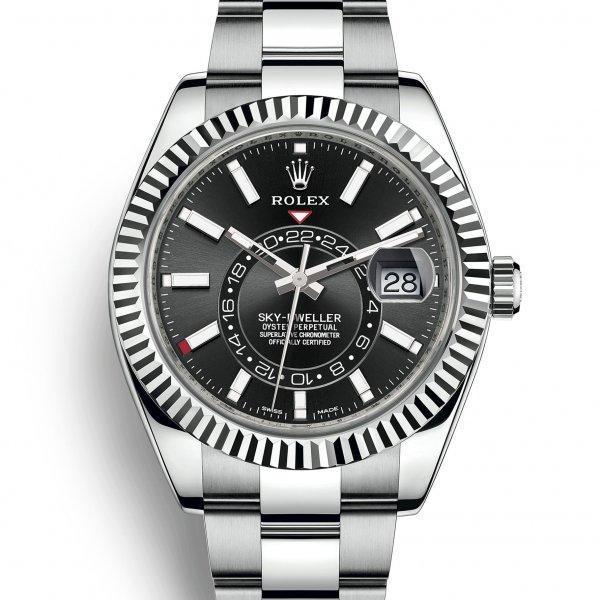 ホワイトロレゾールのオイスター パーペチュアル スカイドゥエラーは、ブラックダイアルとオイスターストラップを備えた時計で、ダイアル上のオフセンターに配置したディスクで第2タイムゾーンを表示する。